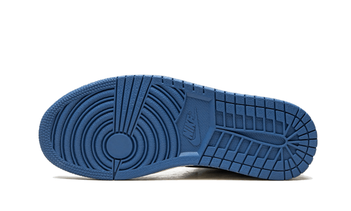 La Air Jordan 1 Retro High OG SP Travis Scott Fragment Military Blue presenta una base in pelle bianca granulata, completata da accenti blu vicino al toebox, al colletto e al tallone. La firma dello Swoosh invertito del rapper di Houston cade sull’intersuola color crema. Elementi di branding Cactus Jack e Fragment si trovano sul tallone e sulla linguetta.