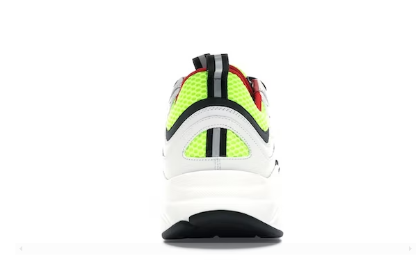 Sneaker “Bianco Giallo Rosso”. Realizzato in morbida pelle di vitello, il design bilancia una silhouette robusta e una colorazione bianca pulita con tocchi di nero, giallo e rosso. La silhouette bassa incorpora anche strati esterni in maglia tecnica giallo neon e bianco e una fodera in nylon rosso quasi nascosta che fa capolino sul colletto. A completare la scarpa, il discreto marchio “Dior Homme” è esposto appena sopra l’intersuola.
