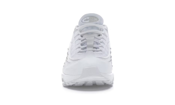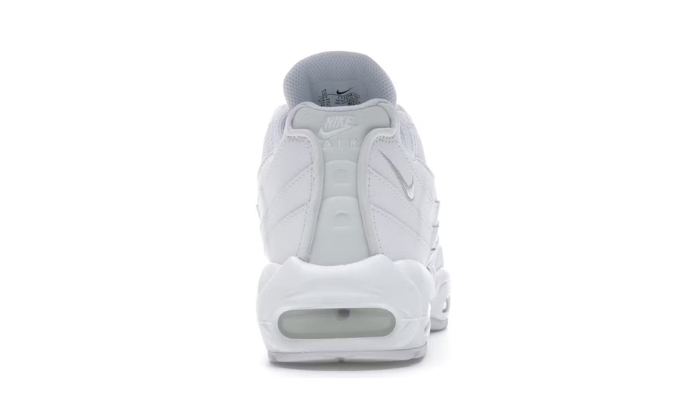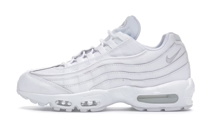Le Nike Air Max 95 Essential White Grey Fog sono bianche con dettagli grigi nebbia. Le scarpe sono realizzate con una tomaia in mesh, rinforzata da sovrapposizioni in pelle pieno fiore. Presentano lacci bianchi e sono di tipo slip on. La suola è piatta con uno spessore di 4 cm. Le solette delle calzature non sono rimovibili e hanno una fodera in tessuto. L’intersuola è in schiuma. La scarpa presenta inoltre un’ammortizzazione Nike Air visibile. Il piccolo Nike Swoop si trova su un lato del tallone.